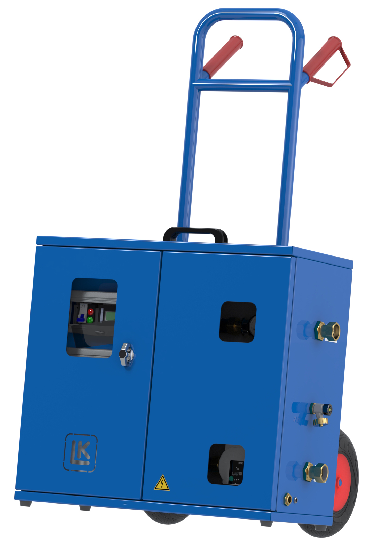 The LK 450 EasyHeat M (manual) 3 kW or 9 kW is a complete portable electrically heated boiler. It is primarily meant to be used as a temporary heater, e.g. for drying concrete slabs installed with underfloor heating or for heating buildings under construction.